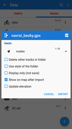 After selecting the file or receiving it from some external application or add-on Locus Map analyses it and modifies the import dialog according to the content - the dialog can process points or tracks or both of them at once.