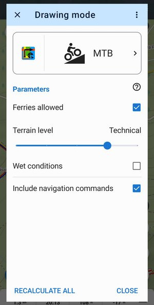 When a routing mode is on, the line between points runs along roads and paths. If you choose to draw manually, the line is straight between points, unrelated to roads. You can use various routing profiles or manual segments between each point of the route according to your needs.