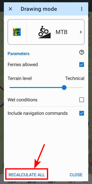 Each profile has additional parameters that influence the route progress - terrain difficulty, ferries, steps, cycle paths preference, wet conditions… To customize the parameters, long-press the route profile button and adjust what you need: