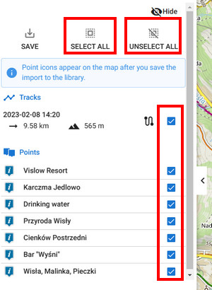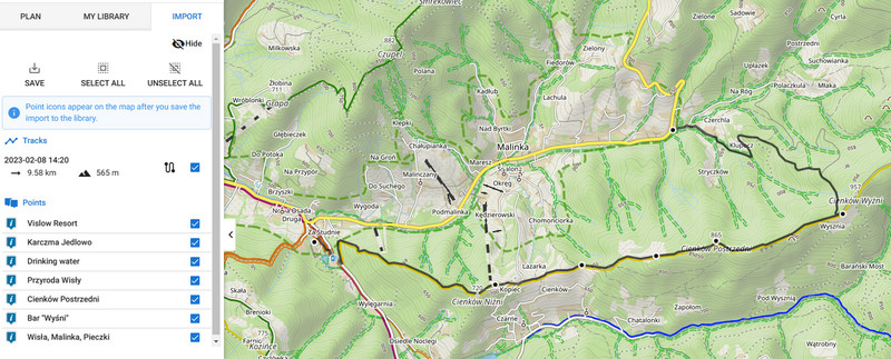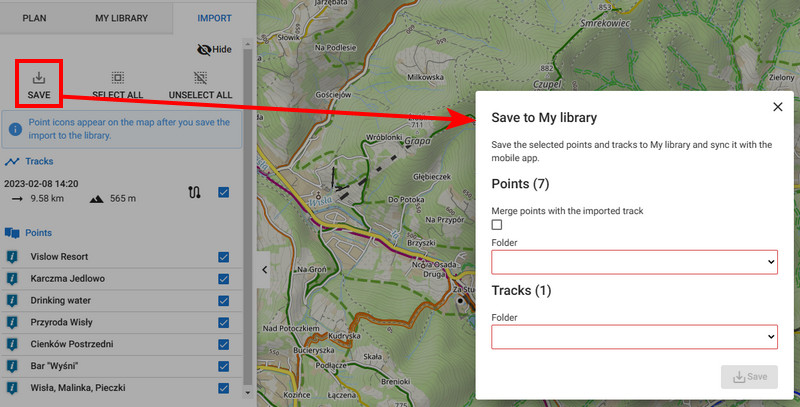 Select folders for the tracks and points separately or check Merge points with imported track.