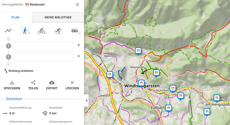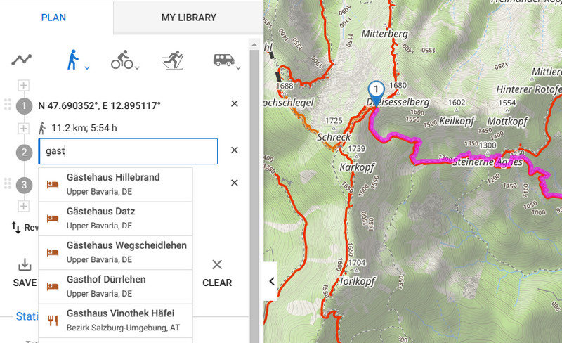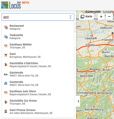The main search box is placed in the top left corner. The search returns POI categories, individual points of interest and addresses and is dependable on the displayed location - it returns results within or nearest to the selected map area. The results are emerging right after typing a few characters, you don't have to click on any button.