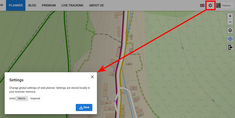 So far, the web planner provides only the setting of units. The units are set automatically to the metric system so if you need to change it click the settings button in the top right corner of the map screen: