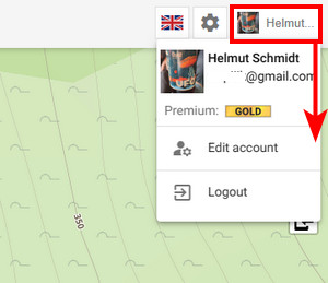 When you are logged in your Locus account name appears in the top right corner. Clicking it opens details (full name, address, Premium status) and options to edit the account and log out: