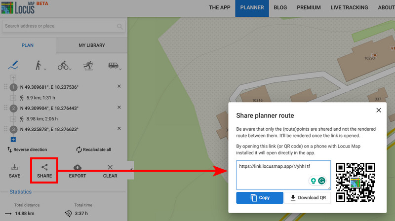 When you have planned a route, tap the Share button. A popup emerges, displaying a unique link that can be copied to the clipboard, loaded via QR code and shared: