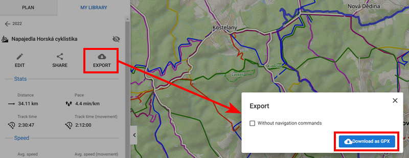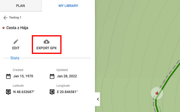 You can export single tracks and routes in GPX format. Routes can be exported right after you draw them in the planner >>.