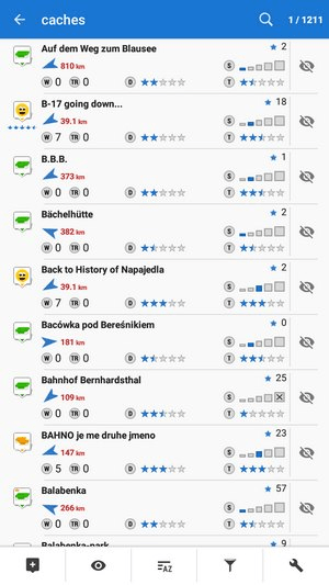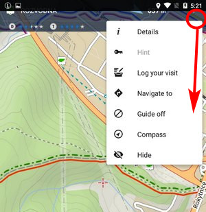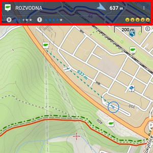 It displays information about the point, its distance and direction. In case of guidance to a geocache there are also other facts like the cache type, difficulty and terrain. Tapping the panel displays the point detail screen.