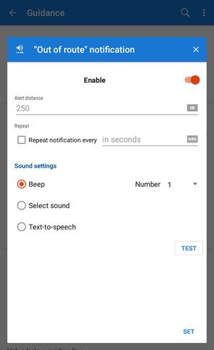 Locus Map can notify you when you leave guided route. Just set up the alert distance and type of alert: