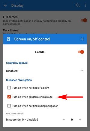 To save your battery energy you can set automatic screen switching on. The screen lights up simultaneously with the sound notification of the route turns.