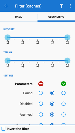 Basic GC filtering - you can filter geocaches by name, GC code, icon (type) and distance: