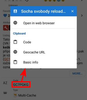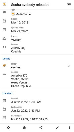 The bottom bar of the geocache detail panel contains tools common for all other points - navigation, sharing, info editing and management tools. But also geocache-specific add-on menu: