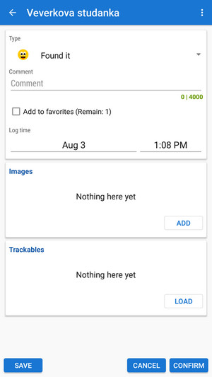 Then you can add a comment, define the log time and date (it is pre-filled by the actual date), add images and log trackables (only when logging online)