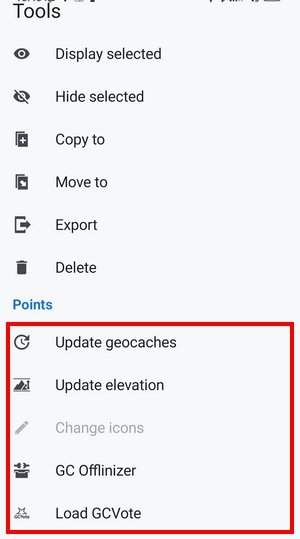 Besides common functions like Copy/Move/Export/Delete or Update elevation the menu contains several GC-specific features: