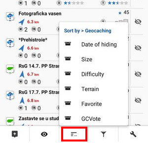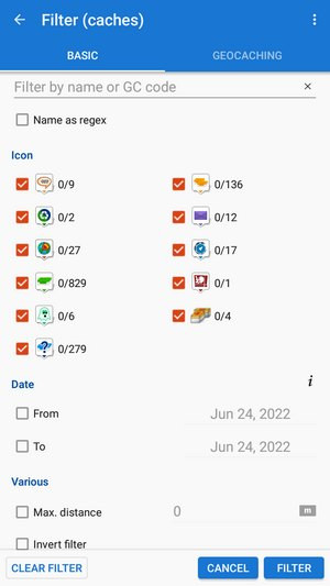 Basic GC filtering - you can filter geocaches by name, GC code, icon (type), date and distance: