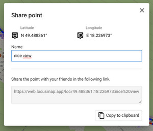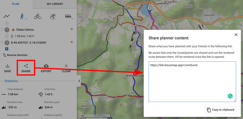 When you have planned a route, tap the Share button. A popup emerges, displaying a unique link that can be copied to the clipboard and shared: