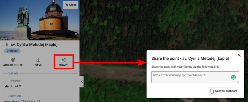 If you need to share a link to an interesting place marked on the map, tap Share on the detail panel of the LoPoint: