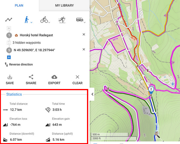 Statistics of the route like distance, estimated time or elevation gain are displayed in the left panel under the itinerary.