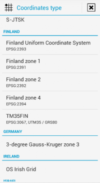 # header from above 1|2391|Finland zone 1|EPSG:2391|Finland 1|2392|Finland zone 2|EPSG:2392|Finland 1|2393|Finland Uniform Coordinate System|EPSG:2393|Finland 1|2394|Finland zone 4|EPSG:2394|Finland 1|3067|TM35FIN|EPSG:3067, UTM35 / GRS80|Finland 1|3857|Pseudo-Mercator|EPSG:3857,900913, WGS84 / Sphere|World 1|31467|3-degree Gauss-Kruger zone 3||Germany