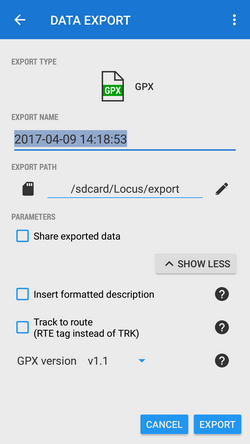• Export type - indicates the selected format of exported file or external service into which the track is exported. Tap to change the export format or select a web service (Strava, Runkeeper, OSM…).