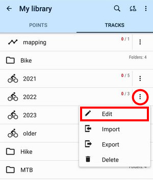 Tracks and routes stored in a folder in the Track/route manager can have unified style settings. These settings can be edited in the folder action menu: