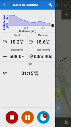 Recording a track is technically a continuous saving of a chain of trackpoints - places that are marked by unique GPS coordinates - like breadcrumbs that someone leaves behind when moving. The density of the trackpoints/breadcrumbs can be pre-defined in recording profiles and varies according to used activity - walk, run, biking or driving by car. The faster the activity, the less dense are the trackpoints and the longer is the supposed traveled distance.