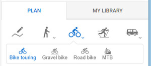 The first step is to select an activity for which the route will be created. The planner offers two walking, three biking, two driving, one cross-country skiing and one manual drawing mode.