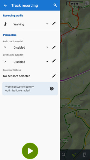 System battery optimization warning - if the optimization is enabled for Locus Map the recording will not function correctly as the system will try to kill Locus when it works in the background. We strongly recommend to exclude Locus Map from ALL means of battery optimization. More >>